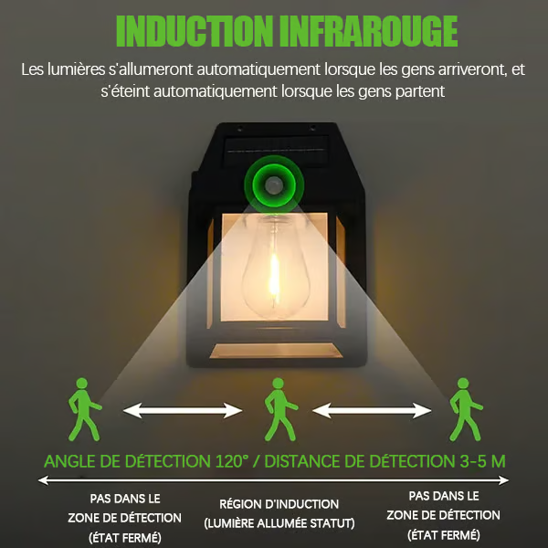 Aucune facture d’électricité annuelle Résistante à la pluie, au soleil et à la poussière Allumage automatique dans le noir Détection du mouvement du corps humain Aucun câblage requis