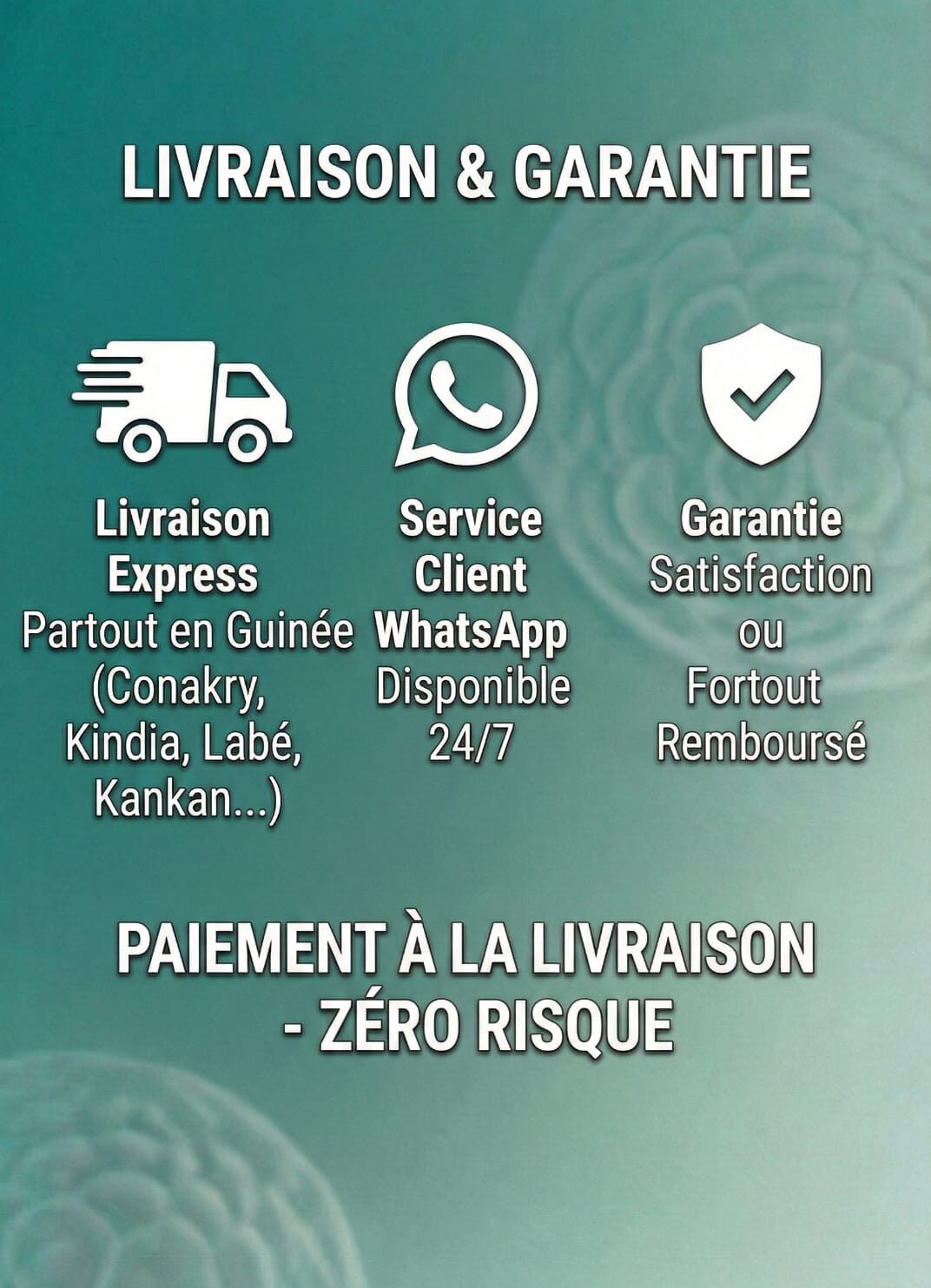 Paiement cash à la livraison. Satisfaction garantie.