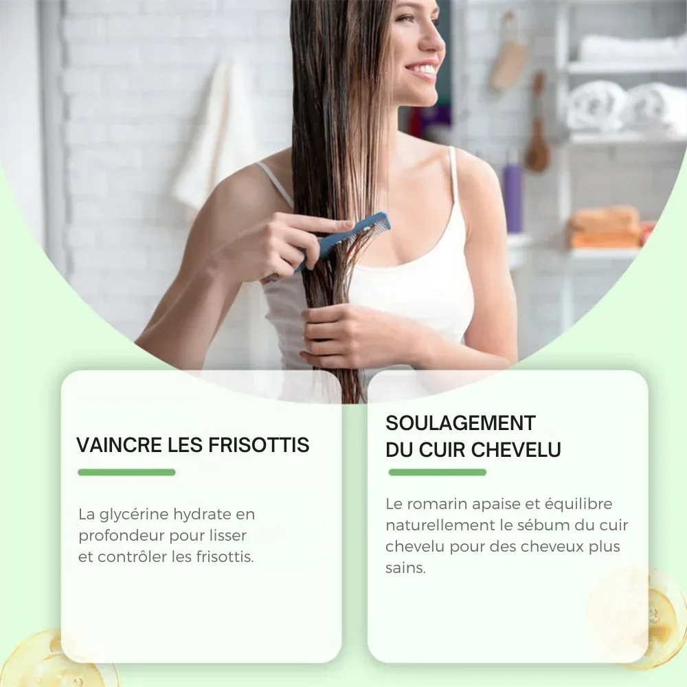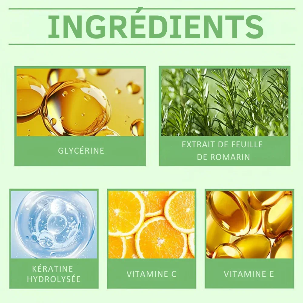 KéraSoin™ combine kératine réparatrice, rosemary bio stimulant, et une formule salon conçue avec des coiffeurs et scientifiques reconnus. À chaque lavage, la kératine comble la fibre, réduit la casse et renforce la structure. Le romarin active la micro circulation, nourrit la racine et stimule la pousse naturelle. Les cheveux deviennent plus denses, plus souples, plus vigoureux, et visiblement plus sains.